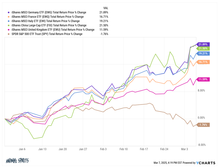 Looking more closely at foreign markets, we're seeing impressive gains between 11-21% for China and major European economies since early this year:
