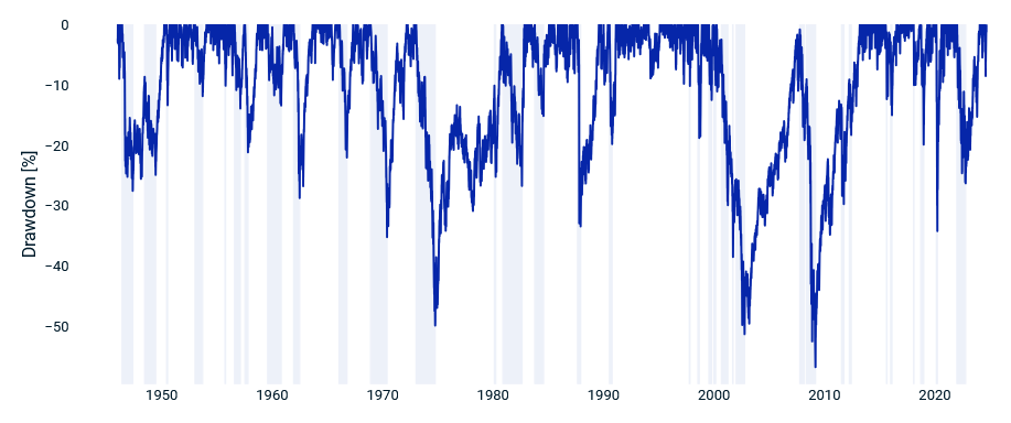 The 1970s into early 1980s, the aftermath of the dot-com bust, and the period following the Global Financial Crisis all saw prolonged drawdowns lasting several years. These were typically severe, often exceeding 50%. The COVID crash in 2020 was unusual—an extremely rapid and deep drop but remarkably brief with markets recovering within months.